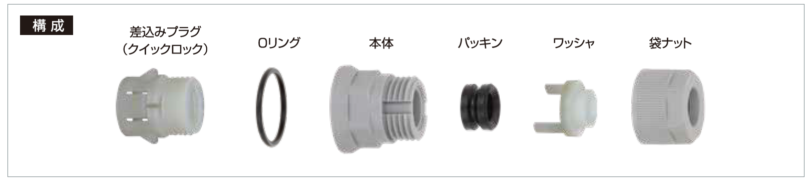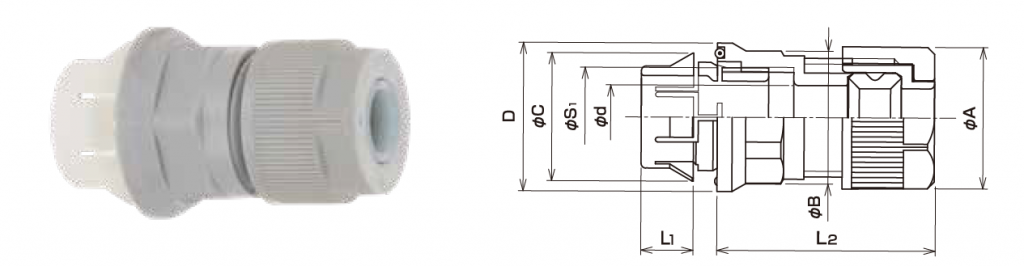 | 品番 | 挿入できるケーブル外径(mm) | パッキン枠番 | 袋ナット | 本体フランジ | D | φC | φd | L1 | L2 | ノックアウト径(mm) | 適合板厚(mm) | 重量(g/個) | |||